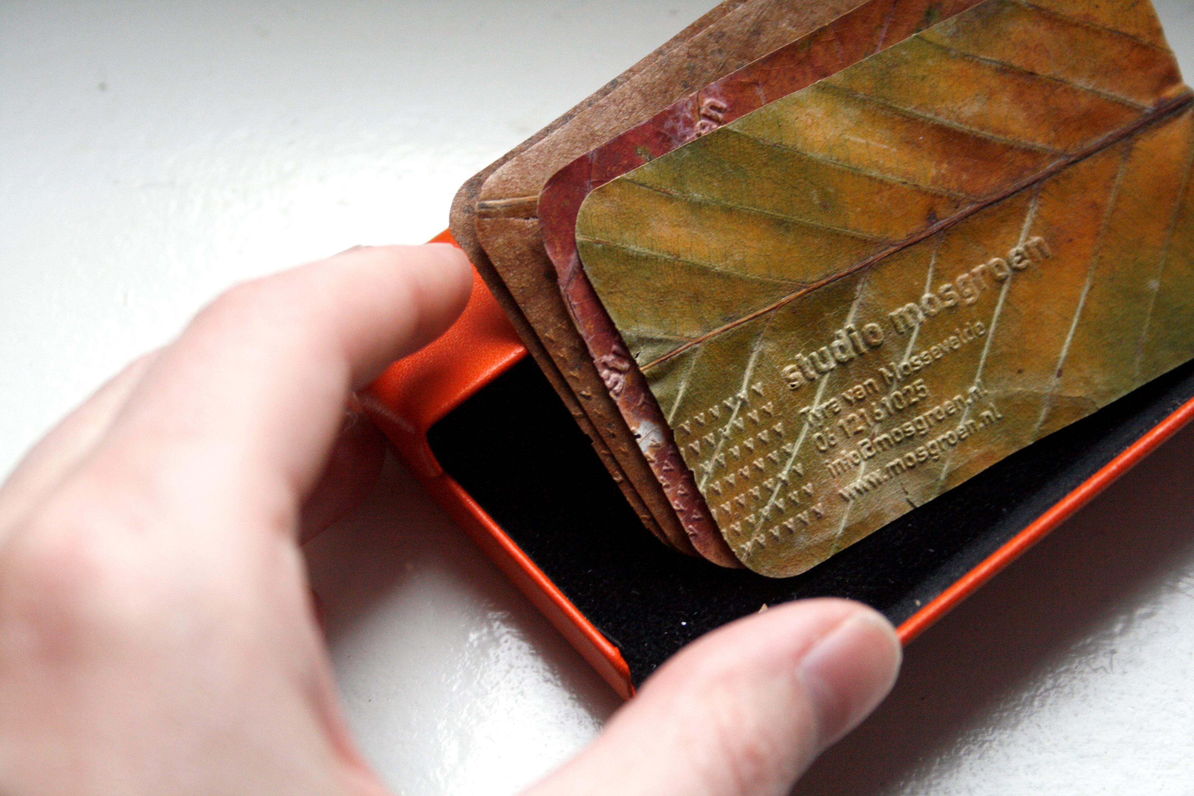 De blaadjes zijn in de herfstperiode van de grond geraapt en gedroogd. Met een preegstempel zijn de letters gepreegd. Hierdoor is het gebruik van inkt overbodig. De hoekjes zijn met een hoekpons bewerkt. De blaadjes vervangen het papier en zijn na gebruik weer direct terug te brengen in het ecosysteem. De informatie op het kaartje is zo gekozen dat de informatie een lange geldigheidsduur heeft (bijvoorbeeld geen adres).