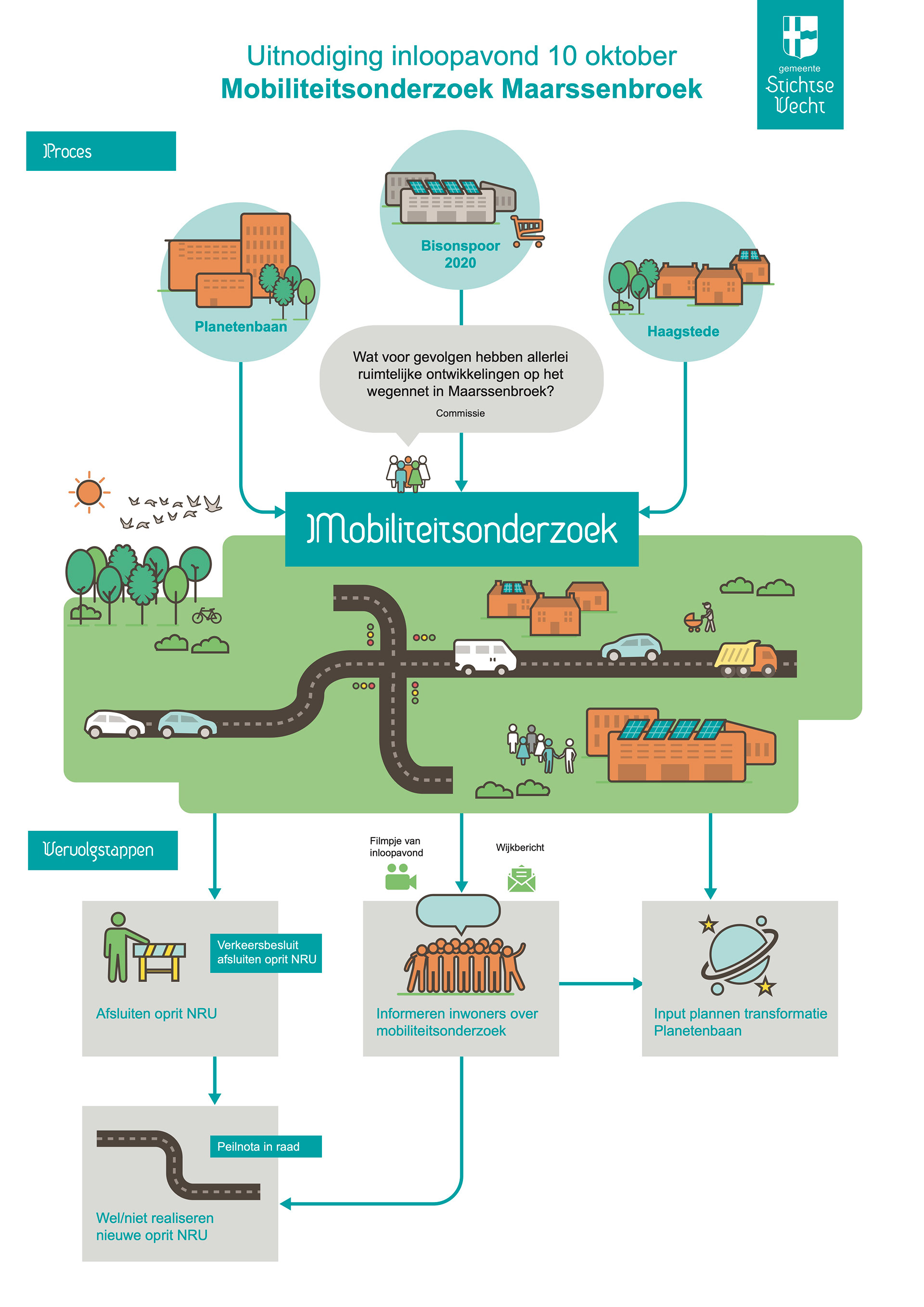 De poster geeft inzicht in het proces en de vervolgstappen van het mobiliteitsonderzoek Maarssenbroek. Tijdens de inloopavond is de poster als praatplaat gebruikt.